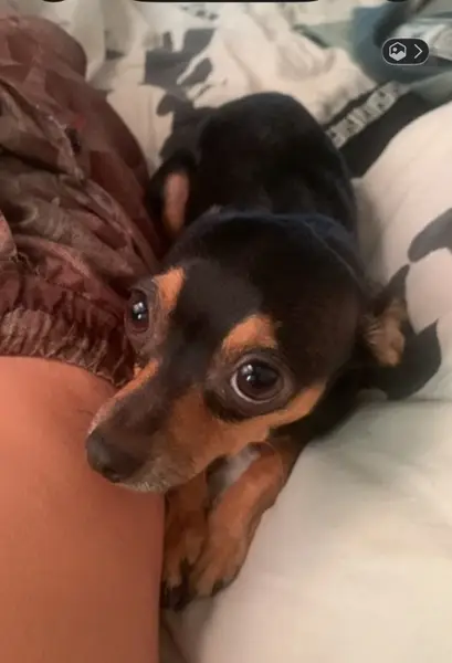 Мальчик,похож на чихуахуа,цвет коричневый с рыжим,на шее широкий коричневый ошейник.