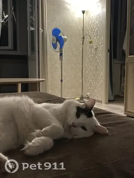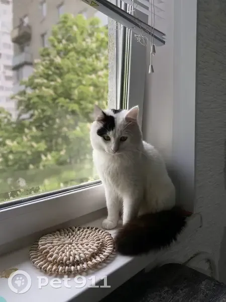 Белый окрас с черными пятнами и хвостиком. Достаточно крупный, глаза желтые. Выпал с балкона, хотя раньше никогда не интересовался сеткой и прыганием на окна. Нашла его под окнами, но в состоянии аффекта не смогла удержать и он убежал в неизвестном направлении