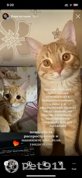 рыжий, среднего размера, ему полтора года. Пугливый, но очень ласковый. На имя Арес и «кскскс» отзывается в районе часа-двух ночи видели его в последний раз у двора, ночью кот не отзывался и не пришел домой. У калитки следы крови, скорее всего ранен пожалуйста, сообщите/сфотографируете сразу как увидите, мы очень ждем его дома