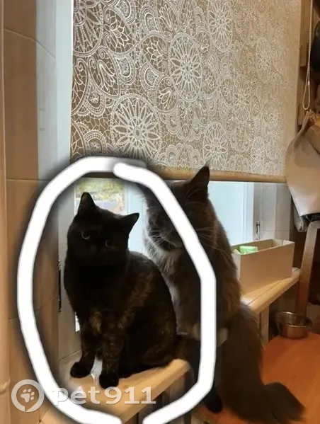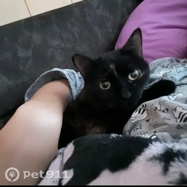 Черный окрас с маленькими рыжими вкраплениями На ушке маленький шрамик Глаза желтые Очень ласковая, ручная Выбежала из дома, побежала на крышу и не вернулась
