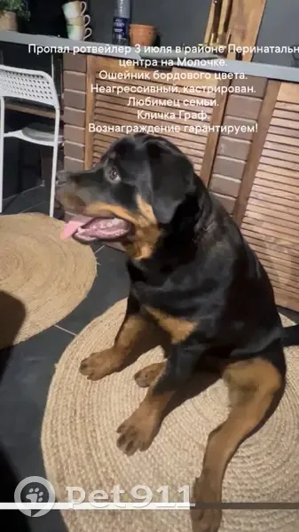 Пропал ротвейлер 3 июля в районе Перинатального центра на Молочке. Ошейник бордового цвета. Неагрессивный, кастрирован. Любимец семьи. Кличка Граф. Вознаграждение гарантируем!