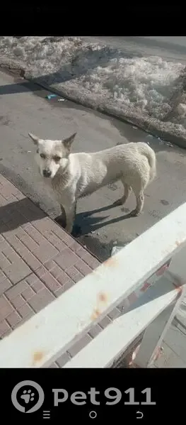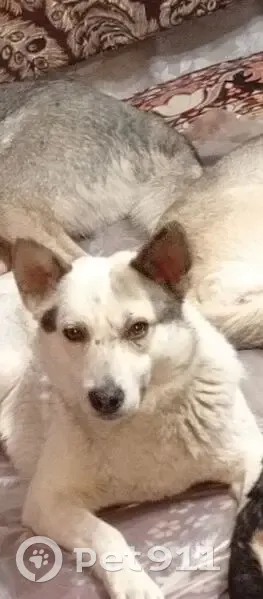 Сероватое правое ухо правое и немного пятно на левом. Нет ошейника и чипа. Убежал напугали собаки