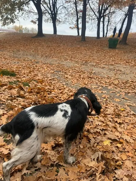 Кобель русский спаниель, 7 лет, черно- серо-белый, лапы светлые с бежевыми крапинами, кличка Джин, умный и самостоятельный, к хорошим людям очень добр, был без ошейника. Это не просто собака, это члены семьи и всеобщий любимец.