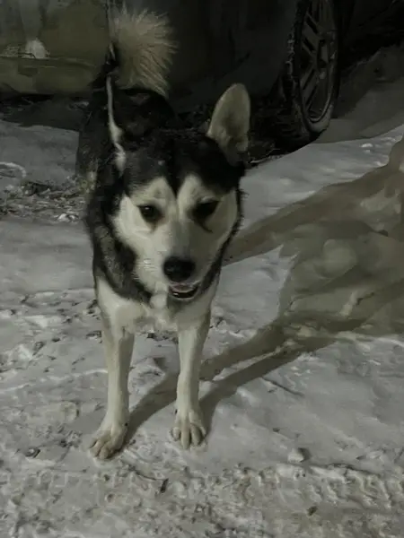 Пропал хаски, отличительная черта - темное пятно на языке. Взрослый, в ошейнике, голубые глаза.