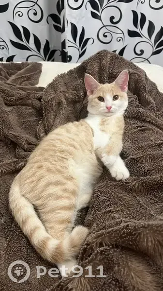 Особенности внешности: Окрас: светло-рыжие полосы по спине и бокам, грудь, живот и лапы — белые. Глаза — светлые, янтарные. Уши среднего размера, розовые внутри. Хвост с мягкими светлыми кольцами. Уходила на работу , не заметила как кошка выбежала , дома нигде нет.