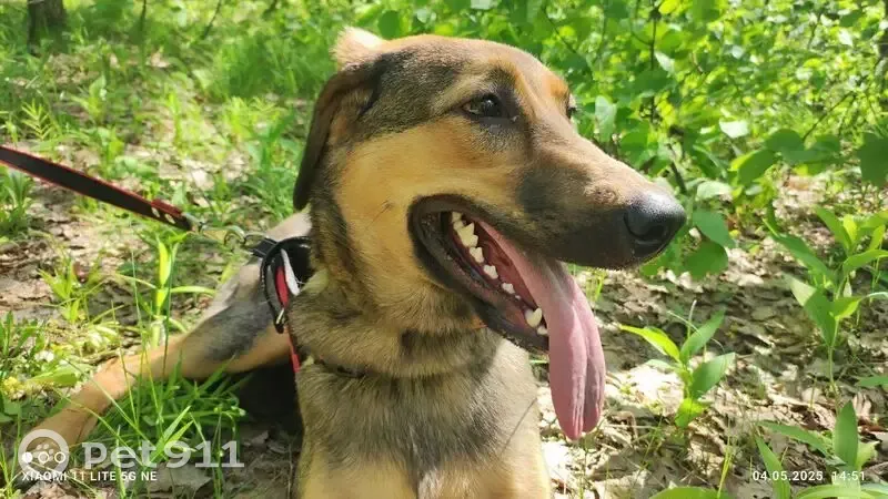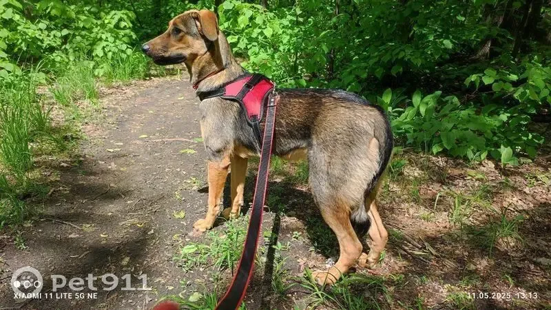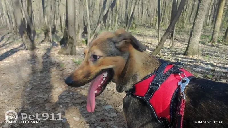 Окрас чепрачный, уши висят, стройная, длинные лапы, красная яркая шлейка, вес 25 кг, возраст 8 месяцев, кличка Багира. Отбежала в кусты с тропинки и потерялась. Не агрессивная, осторожная, пугливая, похожа немного на гончую. Очень домашняя, ухоженная, ласковая.