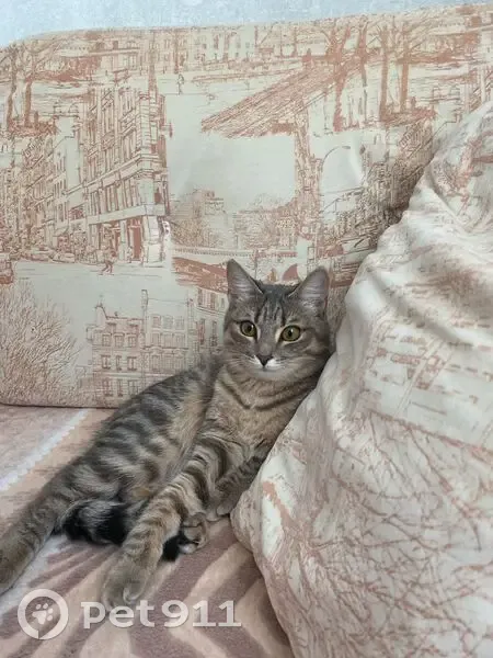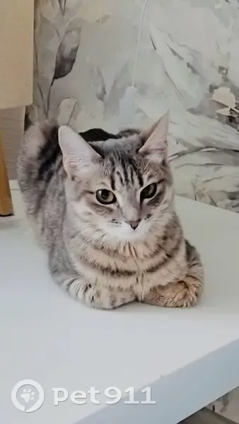 Кошка серо/бежевого цвета в бандаже после операции. Глаза подведены чёрными стрелочками. Бандаж детского раскараса с завязками на спине. Кошка нуждается в медицинской помощи. Помогите её найти