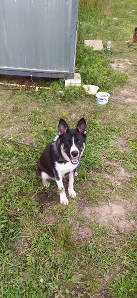 На ухе зеленая штучка из за того, что собака была дворовой. Окрас - черного цвета с светло бежевым. Одно ухо у собаки вниз, а второе в верх