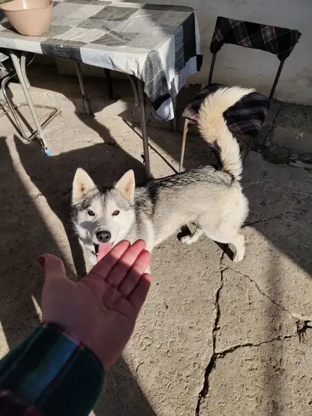 Хаски, мальчик, молодой. Прибился на круге в Таганрог из Николаевки.,, Стройдвор,, ,, Газпром,,. Видно, что домашний. Кушает из рук