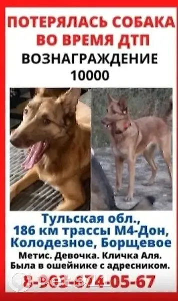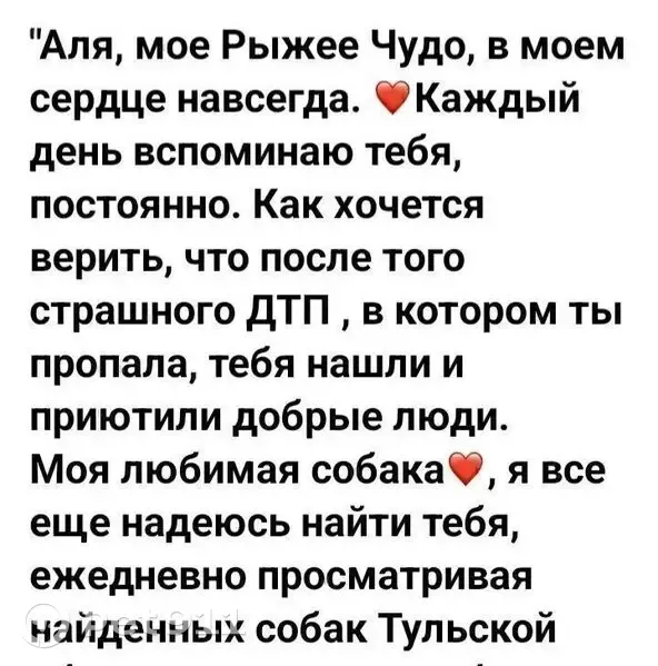Рыжий альбинос,карамельный нос, брови и глаза рыжие. На груди белое пятно. Черного в окрасе нет вообще. Пропала 2 года назад ДТП. Трасса М-4. 186 км. Борщевое Колодезное. Может кто приютил. Не верится, что могла пропасть бесследно.