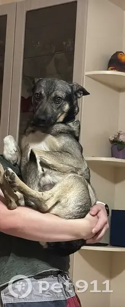 Серая дворняга, убежала из дома и не вернулся, в ошейнике, черный с красной застежкой