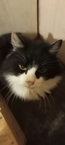 Кот, окрас спинка чёрная, лапки и живот белые, пушистый.