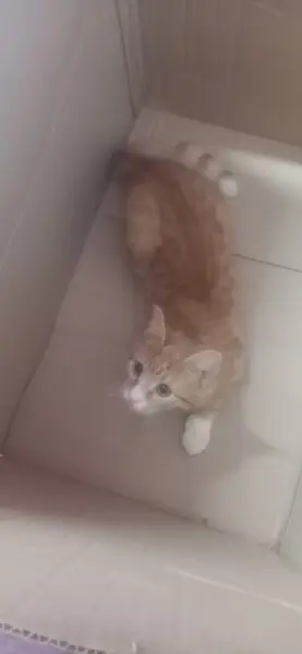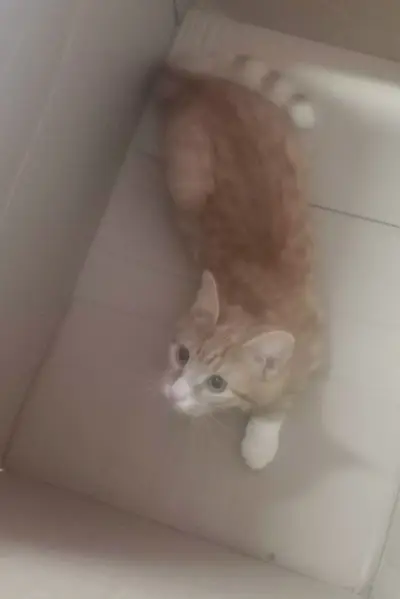 Рыжая, с белым воротником и лапами. Обнаружили случайным образом на дереве.