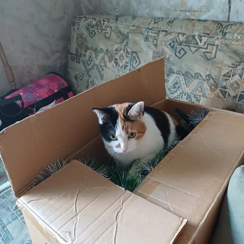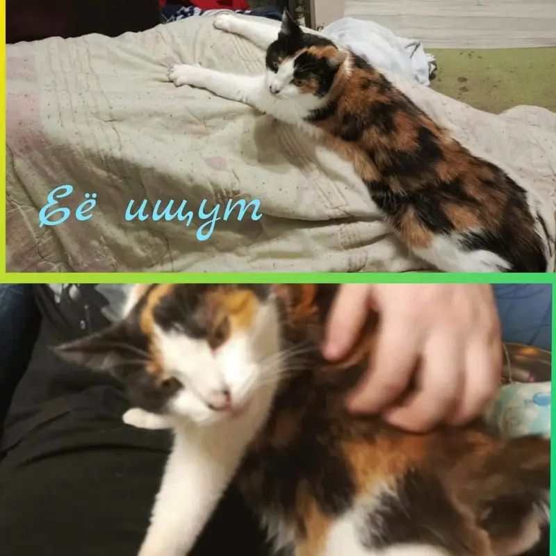 Пятнистая кошечка, упитанная, в ошейнике. С 10.02.2025 гуляет по подъездам дома, подкармливаем, но взять себе возможности нет.