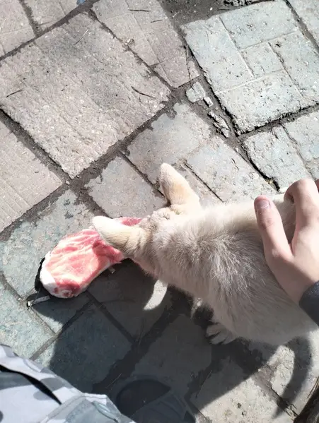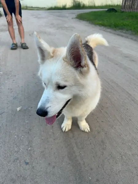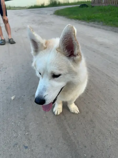Палевый или белый окрас. Прибился на заправку г. Руза . Пёса ласковый, игривый, любит людей и к ним тянется. Хозяин отзовись! Пёс ждёт тебя.. Спит на траве, ночами холодно, хоть и лето.