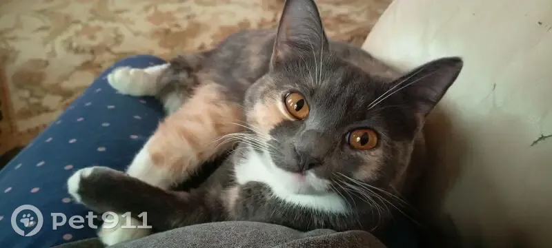 Бусинка многоцветная темно-серо-рыже-белая, лапки до колена белые, глаза жёлтые. Лапки мощные. Кошке 8 месяцев, она стерилизована. Ласковая, игривая, отзывается на кличку Буся.
