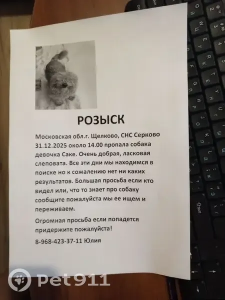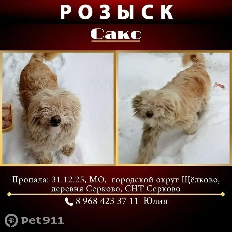 Персикого окраса, примерно 30 см высоты, шерсть волнистая, слеповата. 8 лет. Очень добрая, ласковая подпускает к себе всех. На привязи ни когда не была. Пропала около 14-00