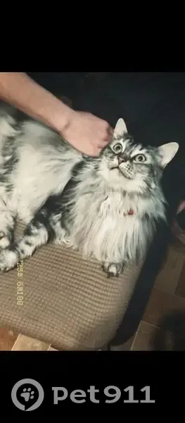 Парода мэйкун, серо-белая, глаза зелёные, пушистая, с ошейником пепельного цвета. Домой приходили работники делать трубы, возможно, могла выбежать, когда они заходили, или уходили, точно не знаем