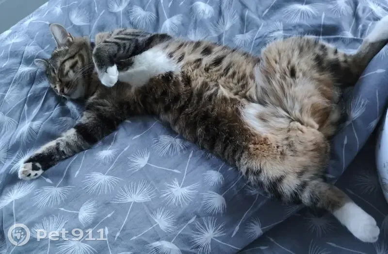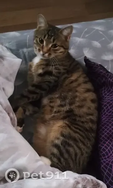 Окрас черепаховый, белая грудка и белые носочки. Фиолетовый резиновый ошейник.