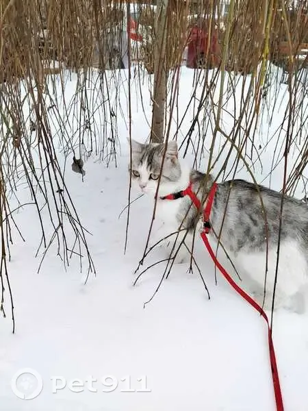 Окрас серо белый, серая спинка, голова и хвост, как на фото, остальное белое, жёлтые глаза. Убежал на прогулке , вырвался из шлейки, сам остался без ничего. Отзывается на кис-кис, на кличку "дымок" или же на кличку "Вася".
