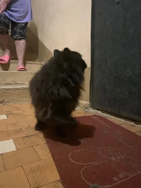 Чёрный, пушистый, по бокам сейчас лысоват немного, глаза карие, очень ластиться.