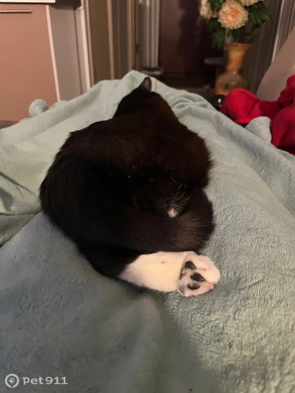 Кошка маленького размера, черно белый окрас, лапки белые, подушечки лапок черные