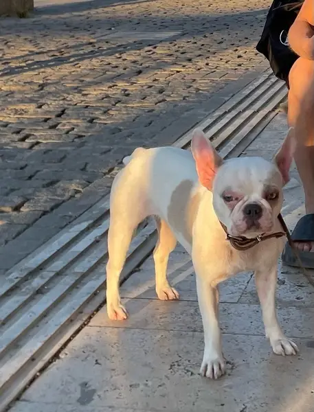 Порода Французский бульдог. Окрас белый с коричневыми пятнами (одно на лице, второе на попе). Бегал без ошенника по пляжу, был растерян и испуган