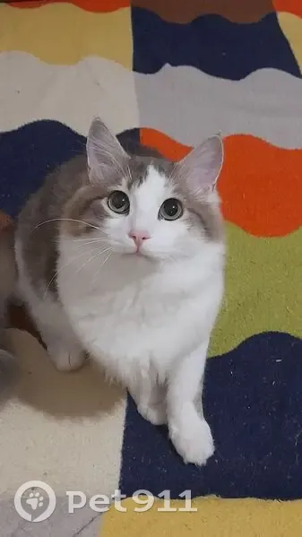 Белый кот с серыми пятнами пушистый зелёные глаза не кастрированный, сбежал на улицу примерно в22:20 во округе района не нашли у кота серый ошейник кот ласковый но пугливый
