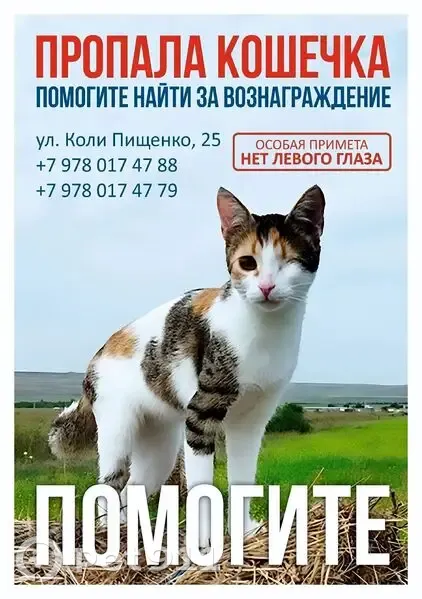 Трёхцветка, больше белого, нет левого глазика, после операции, гладкошерстная, вечером сидела на окошке, сосед видел как отогнула москитную сетку на окне и игралась вылазила залазила, сосед видел, но не посчитал нужным нам сказать, а мы сразу не заметили. У нас первый этаж. Обратили внимание, когда стали кормить котят, а Сонечки небыло. Очень надеемся, что найдётся Её очень ждут дома ️ ️