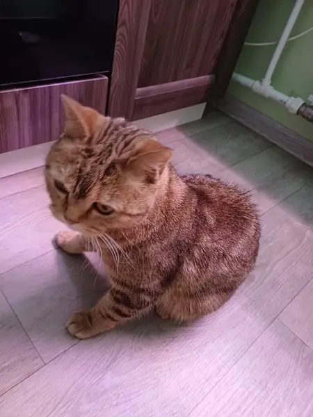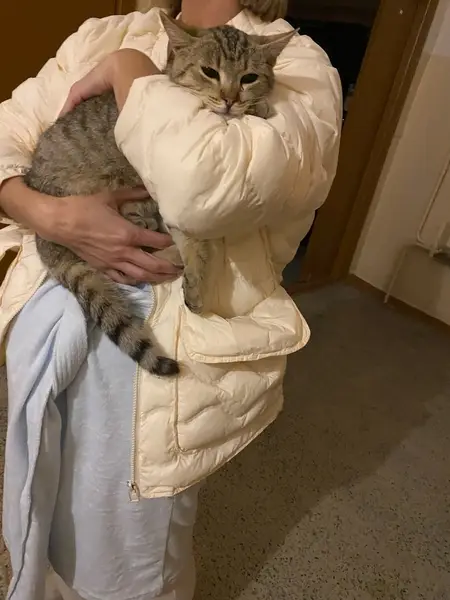 Полосатый, коричневые и бежевые полоски, грудка светло коричневая, глаза серые, очень пугливый, кастрированный. Спрыгнул с балкона на втором этаже, под балконом есть козырек первого этажа.