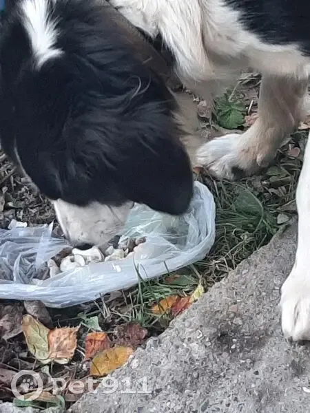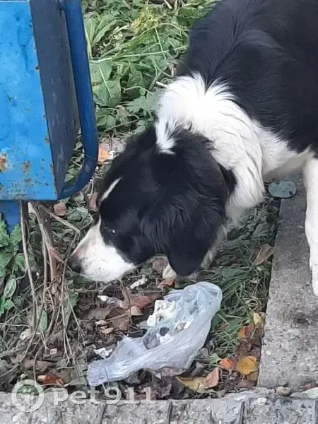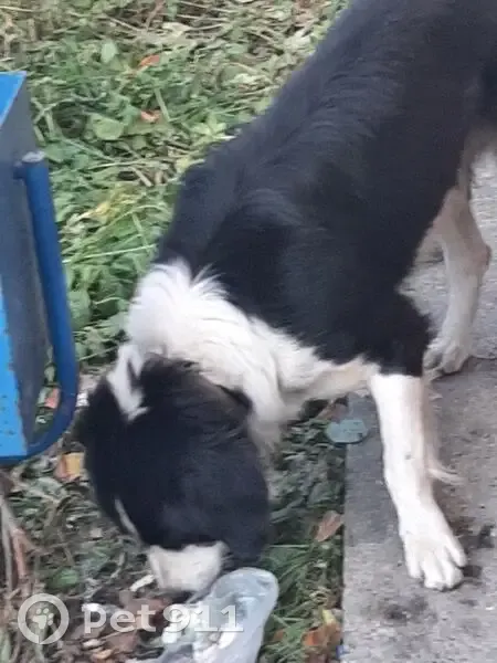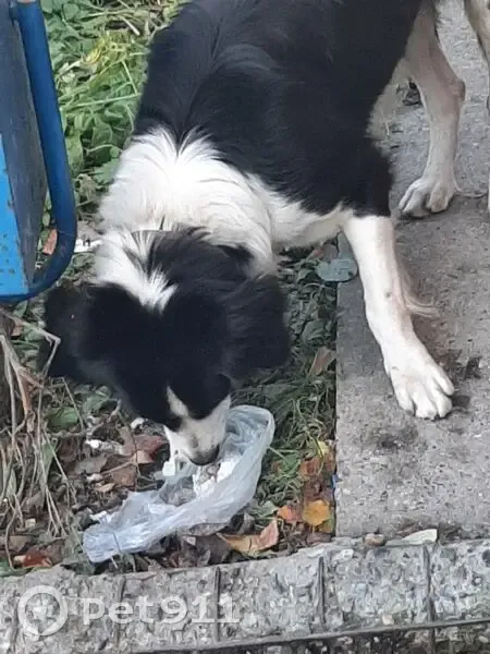 Белый с чёрным, взрослый пёс, скорей всего мальчик. Лет 6-7 навскидку. Спокойный. Размер чуть больше спаниеля. Чёрный поводок на шее. Лежит возле подъезда уже с часу дня. Видно что домашний. К людям спокоен. Сделала ещё фото. Покормила. Точно мальчик.