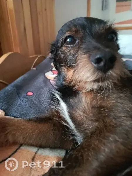 Выбежал со двора. Метис, помесь с терьером. На спине черная широкая полоса, бока коричневые. Мордочка около рта почти седая. Хвостик длинный. В высоту 30 сантиметров. На грудке тоже есть седые волосы.