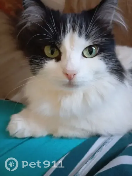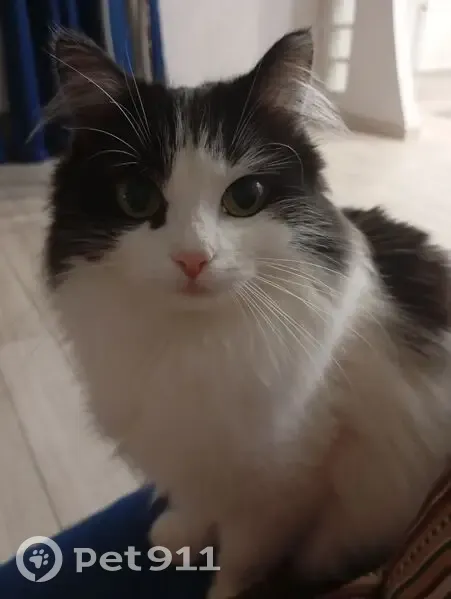 Окрас бело-черный. Хвост пушистый, чëрного цвета. Пропала после посещения вет. Клиники, выскочила из переноски. На правой, передней лапке бинт после забора крови, белого цвета в красные сердечки. Не контактна, в сильном стрессе. Очень пуглива.