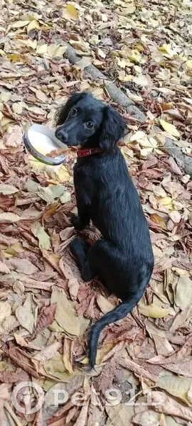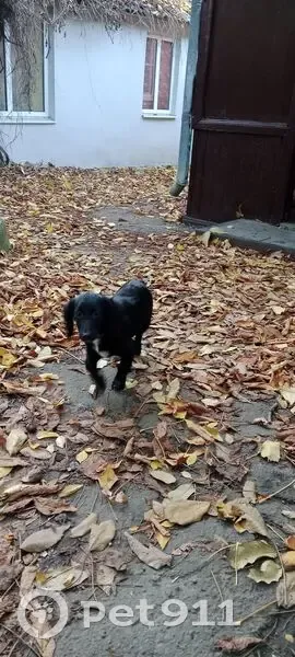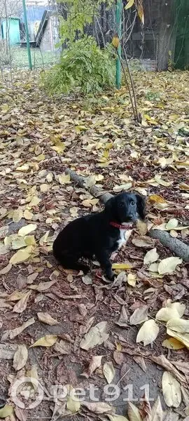 Окрас черный с белой грудкой. На белые кончики лапок. Ушки длинные, кудрявые как у спаниеля. На ней был красный ошейник. Она выбежала под ворота и не вернулась.