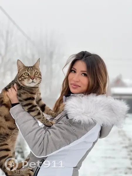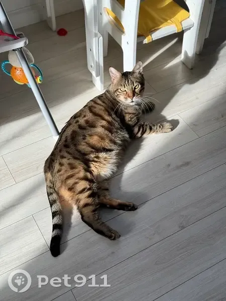 Бенгальский кот, окрас коричнево-рыжий в тигровую полоску с черными пятнами, полный для своей породы, вес примерно на вид 6-8 кг, кастрирован, на вид молодой, на самом деле ему 12 лет, на левой задней лапе примята шерсть (от рождения). Пуглив к посторонним людям, в руки не дается, но сам по себе не агрессивен. Откликается на кличку - Тимон, Тимошка, кот Тим.