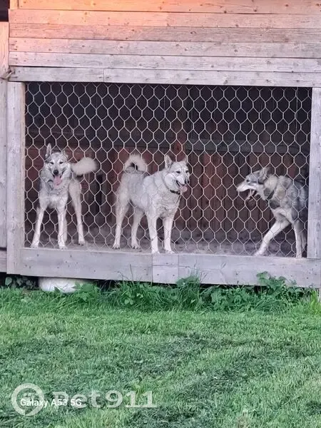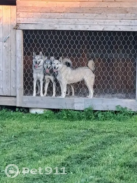 Светлого цвета. Порода Западно- Сибирская лайка. Крупная. Находится в линьке. Выбежала с территории гаражей,в районе конечной остановки 176 автобуса. Кличка Айка. На фото в середине. На последнем фото-справа.