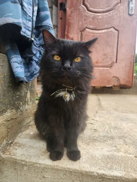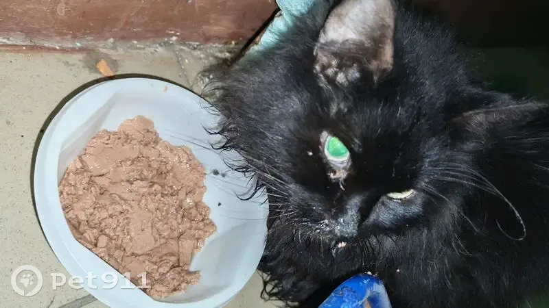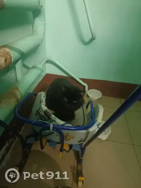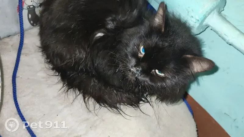 Найден в подъезде чёрный некастрированный кот без ошейника. Очень ласковый и любит много поесть. К лотку приучен. Из зубов только клыки (возможно взрослый).