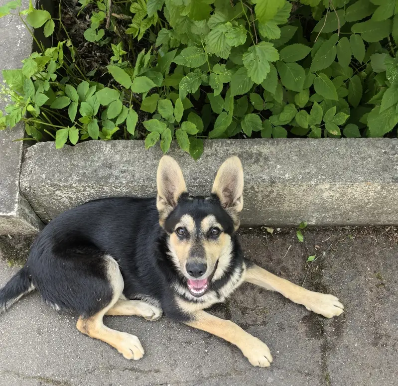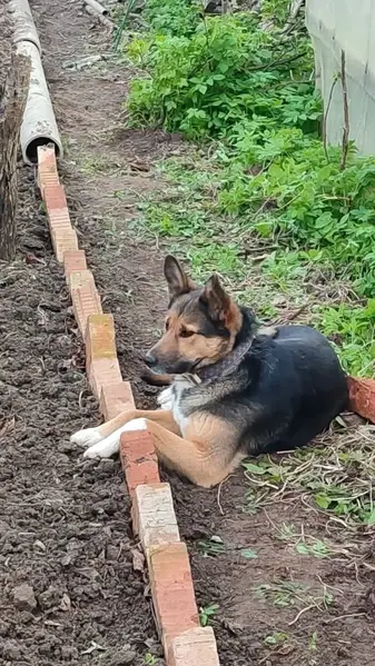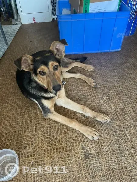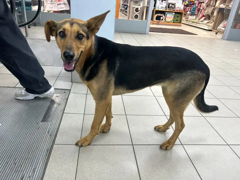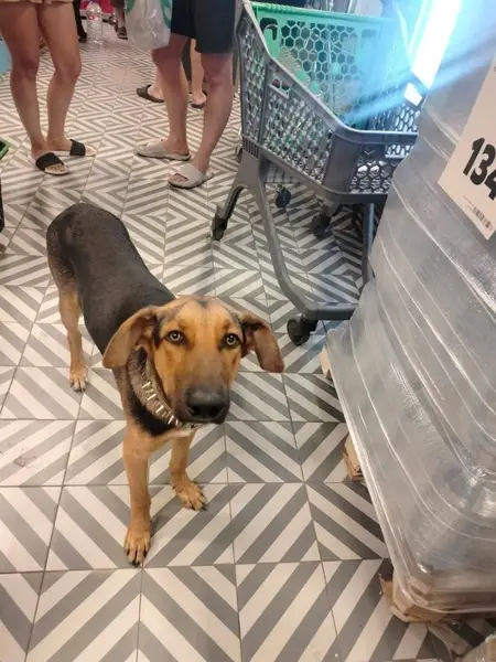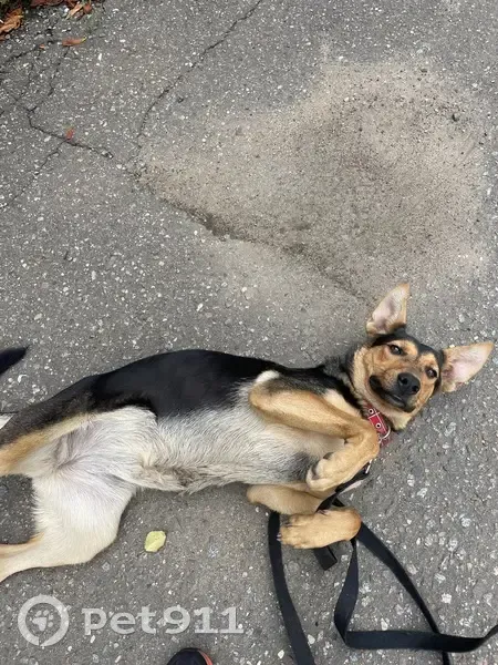 Девочка, в красном брезентом ошейнике, очень ласковая, ходила ко всем ластилась , окрас коричневый бежевый, возраст до года