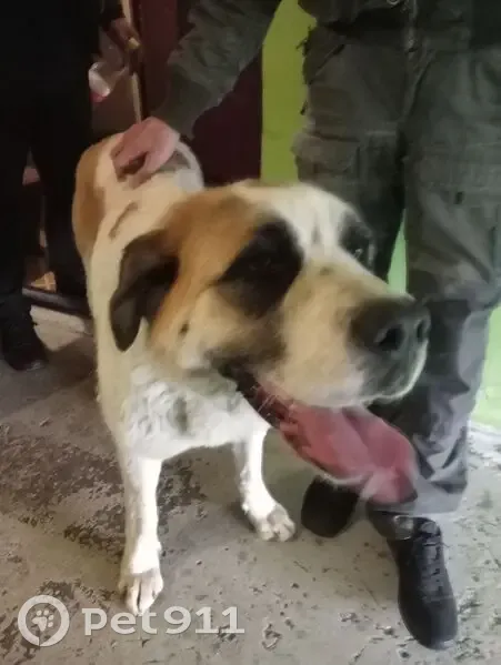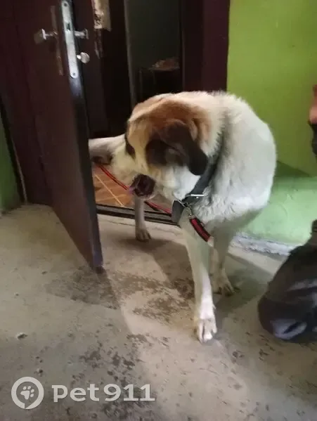 Белая большая собака с крупными рыжими пятнами, возможно сербернар. На собаке одет брезентовый ошейник. Собака видимо недавно ощенилась, так как соски оттянуты, есть молоко. Собака чистая, видно, что на улице недавно.