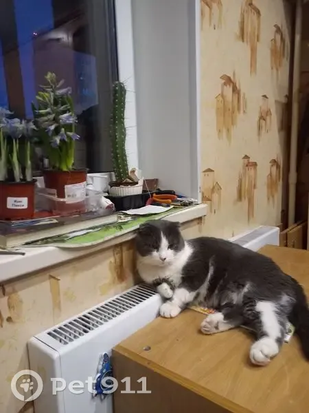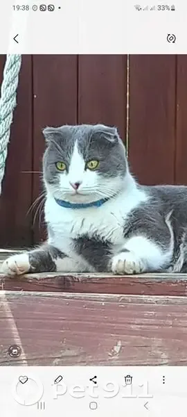 Серый с белыми пятнами ,сын Шотландии и тоже вислоухий ,8 лет, вырвался из рук ,не донесли до машины ,собачка саседсквя испугала . Сигнал под соседнюю и с концами ...
