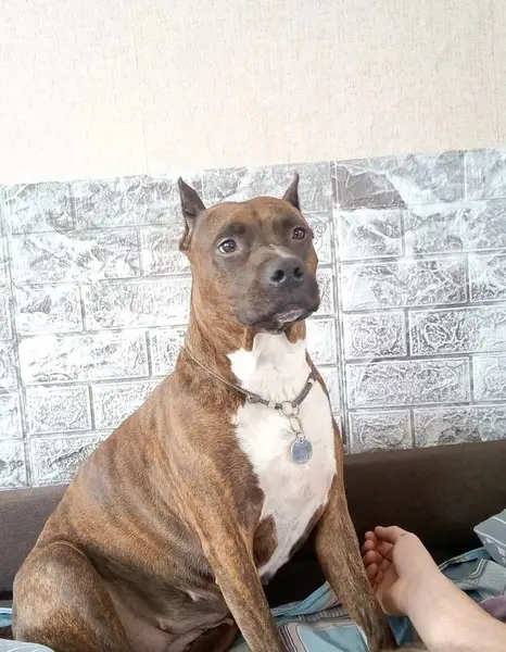 Найдена собака: кобель, порода - Американский стаффордширский терьер Был найден 08.02.2025, бегал по трассе, недалеко от щепкинского кольца (северный обход Ростова), не смогли оставить на морозе, взяли домой на день, на передержку. Оставить не можем, так как работа связана с частыми командировками. Пес ухоженный, очень ласковый, общительный, здоровый. Помогите найти хозяина