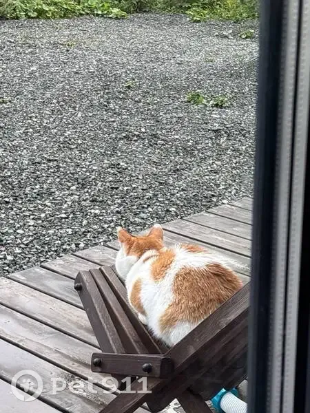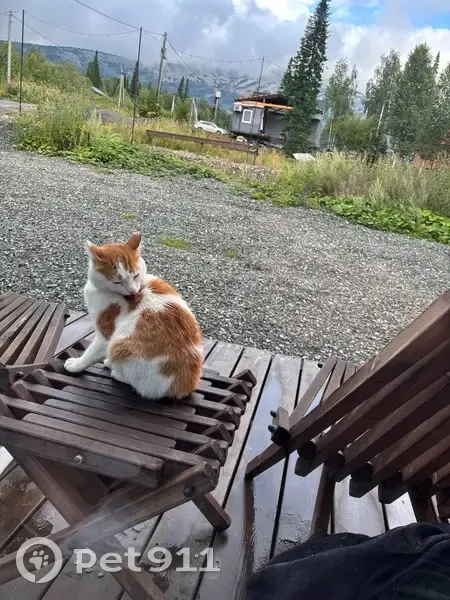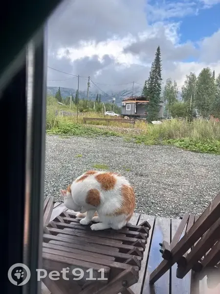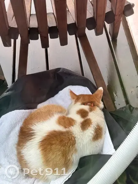 Кошка белая с рыжими пятнами, глаза оранжевые, ближе к желтому. На шее ошейник, цвет оранжевый, ближе к красному. Постоянно мяукает. Очень ласковая и на вид ухоженная, чистая. Найдена 04.08.2025, спряталась под дом где-то в 22:00, просидела всю ночь, под утро вышла и не уходит. Утром я ее покормила, но в дом запустить не могу, к сожалению. Дом не наш, мы снимаем и съезжаем уже в этот четверг. На улице сильный дождь, холодно. Хозяева отзовитесь, пожалуйста!