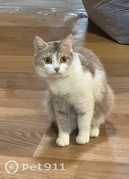 Трехцветный: белый, серый и еле заметный дымчатый. Не слишком большой по размеру, на голове участок отрастающей шерсти после лишая. Зовут Барсик, возраст чуть меньше 1,5 лет