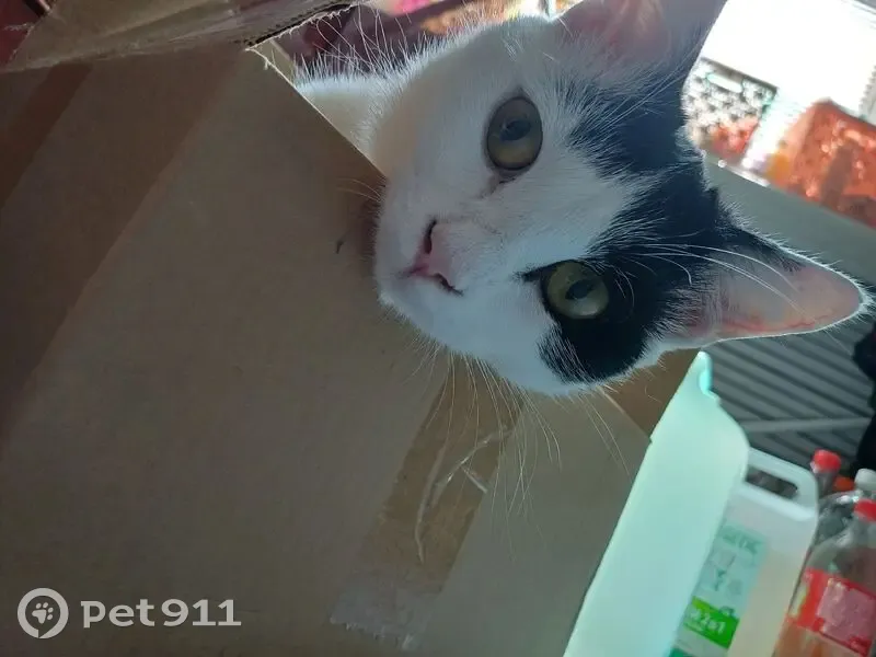 Молодой кот с чёрным хвостом и чёрным пятном на голове, всё остальное белое, есть ещё тёмное пятнышко на подушечке лапки, пугливый. Пропал 4.07 днём, видимо, рассматривал птиц на соседнем участке и как-то порвал сетку на окне и вывалился, соседи сказали, что видели, как он побежал в сторону школы.