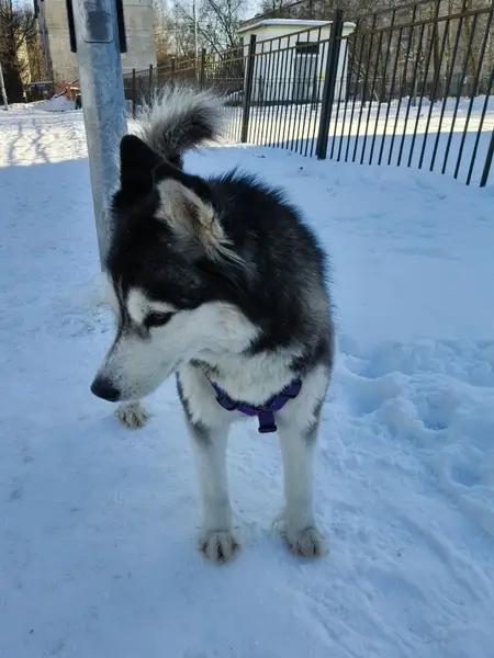 Хаски,длинношерстный. Черный с белым,без маски,очень пушистый хвост. Из-за нападения другой собаки выкрутился из ошейника и убежал. Не агрессивный,контактный.