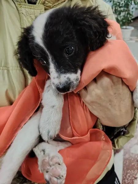 Бело коричневый окрас, розовый ошейник, стоячие уши, размер не большой, 3 месяца на вид