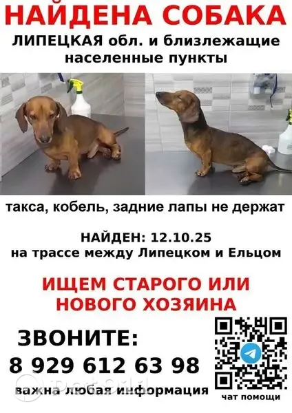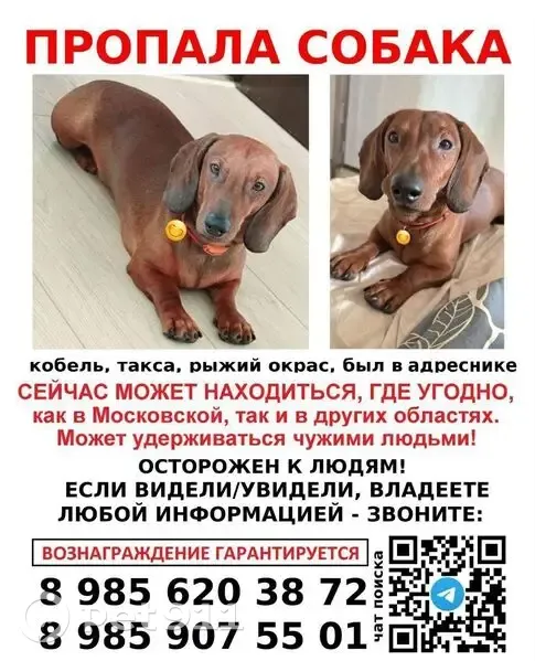 ПРОПАЛА СОБАКА! СЕЙЧАС МОЖЕТ НАХОДИТЬСЯ, ГДЕ УГОДНО! 18.09.25 с дачного участка СНТ Шувалово Киржачского районе (граница Московской и Владимирской областей) пропала такса, кобель, возраст 3 года, умный и доброжелательный пёс. Окрас рыжий. Был в ошейнике с адресником, есть клеймо в паху. Собаку могли подобрать и увезти в любом направлении! Может удерживаться чужими людьми! Приглядитесь, возможно, у ваших соседей по дому/даче, в вашем дворе/ районе появилась похожая такса Пожалуйста, поделитесь информацией в своих районных/локальных чатах и группах Если видели или увидите собаку, попробуйте придержать либо сразу звоните! Если кто-то обладает достоверной информацией, пожалуйста, сообщите! Вознаграждение и конфиденциальность гарантируются! Чат поиска https://t. Me/+OFiMPa29DCozNzRi Телефоны для связи +79856203872 +79859075501