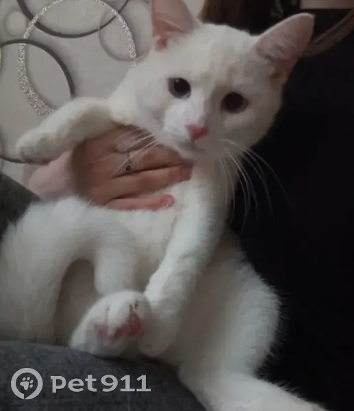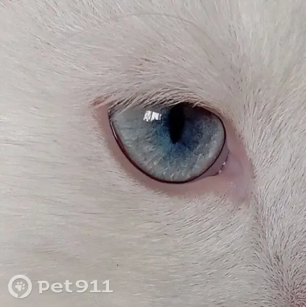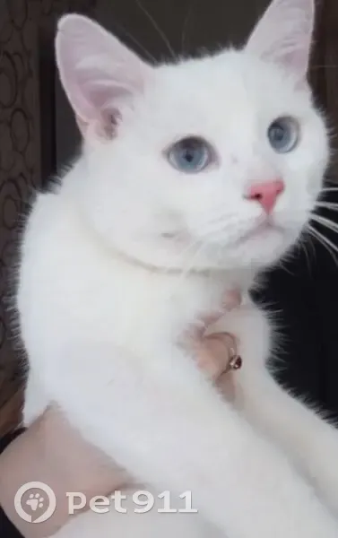 Бело-голубые глаза,белый,игривый.Нашли мы на улице,он игрался.Мы посмотрели на него,хотели подойти,но не смогли.. Пошли дальше.Где-то двадцать минут шли домой и увидели,что он идёт за нами