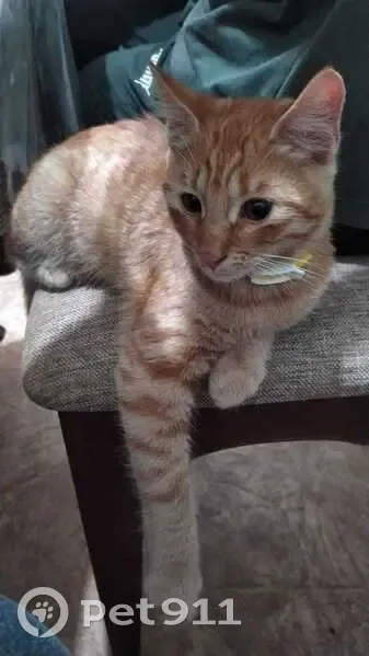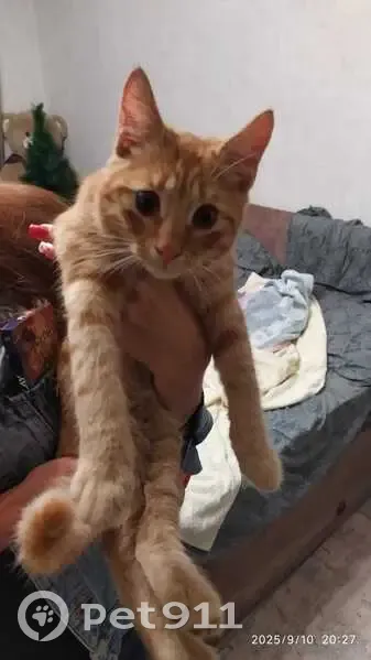 Рыжий котик,с жёлтым ошейником от блох,очень контактный,знает лоток на вид месяца 4. Видно что домашний очень чистый был найден 10.09.25 возле банка России взяла на передержку.