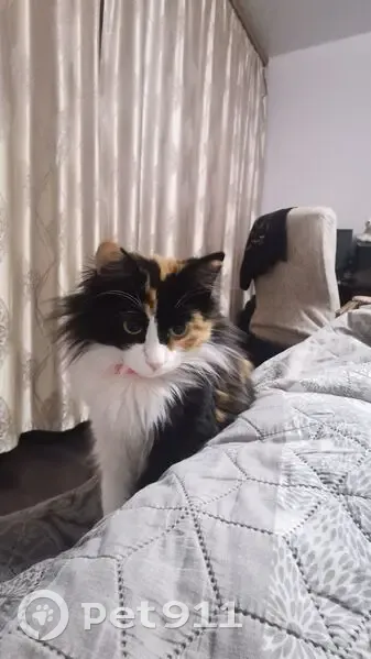 Годовалая кошечка. Трехцветная (окрас черепаховый). Грудка, мордочка и лапки белые. Пушистая, особенно хвост (как у белки). Глаза желтые. На шее красный ошейник от блох. Реагирует на кличку Булочка (Булка).